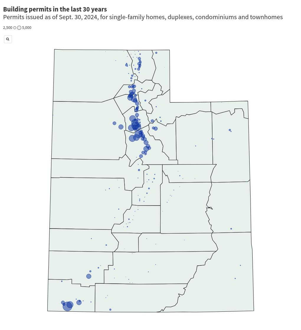 Most of the construction in the state has been in the suburbs of the major metropolitan areas of Salt Lake City and Provo-Orem. Besides the state’s biggest southern city, the most permits in the past three decades have been near those population hubs.