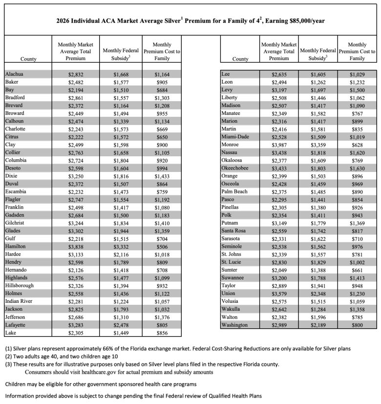 Premiums for a family of four earning $85,000 in Duval County will increase to $864 a month after tax credits in 2026, up from $558.