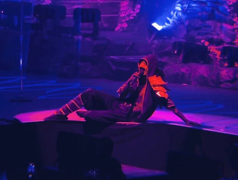 There were no IMAG cameras, no Jumbotron glow to mediate the experience. For once, no one was watching a screen. We were watching Sleep Token in their world, and that was the point. The stage seemed visually like an altar that was somewhere between myth and temple ruins. With three towering levels of jagged stone and a central waterfall, it called to mind Legends of the Hidden Temple — if it had been designed for sacrifice instead of children’s games.