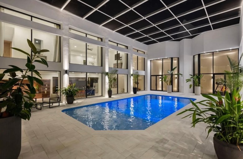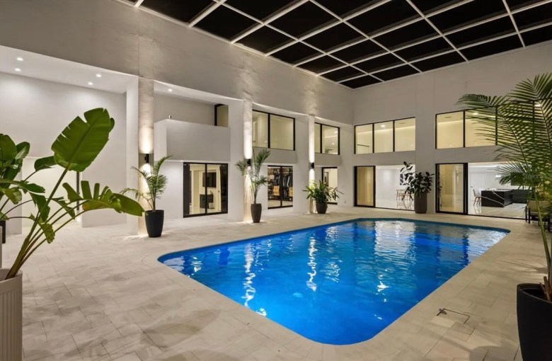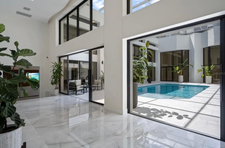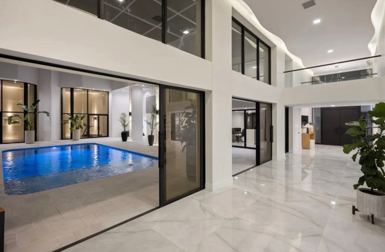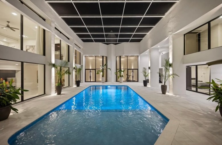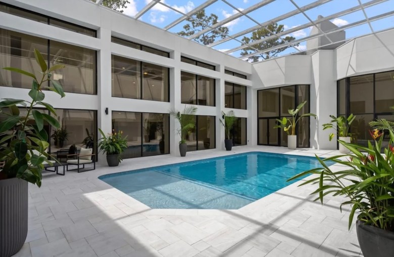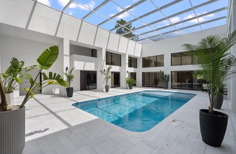 The house has eight bedrooms, nine bathrooms and 14,801 square feet total. It has soaring ceilings, plenty of natural light, an enclosed courtyard pool, a summer kitchen with a pizza oven, a private tennis court and all updated appliances.