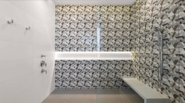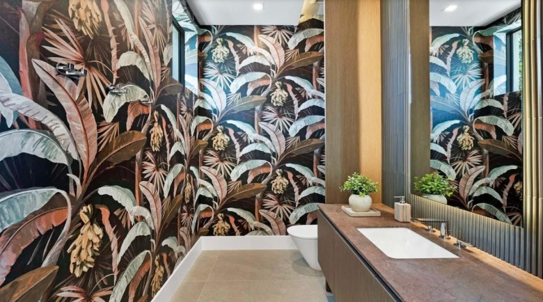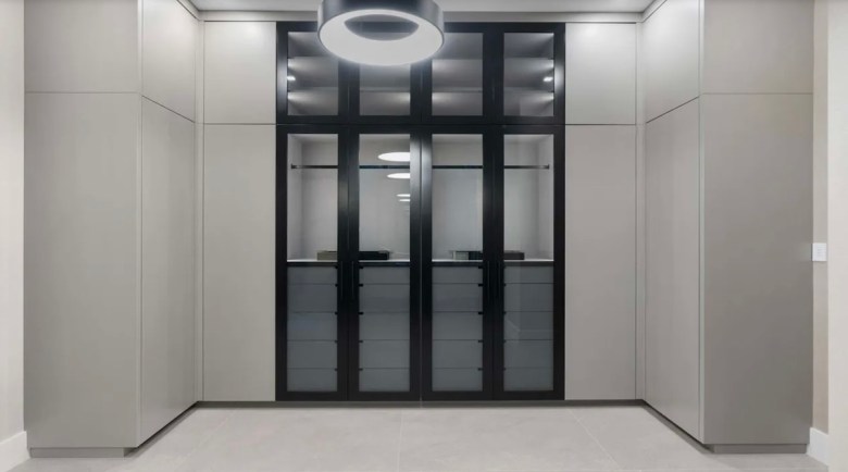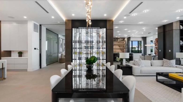 Inside is a chef’s kitchen, clubroom with a designer bar, a formal dining room with a 252-bottle wine display and an additional wine room with space for up to 150 bottles. There’s a home office, gym and a massage room.
