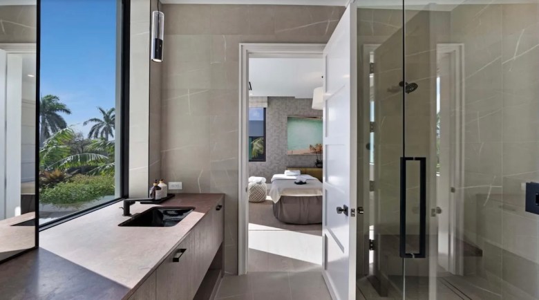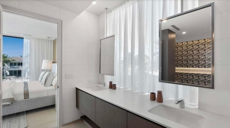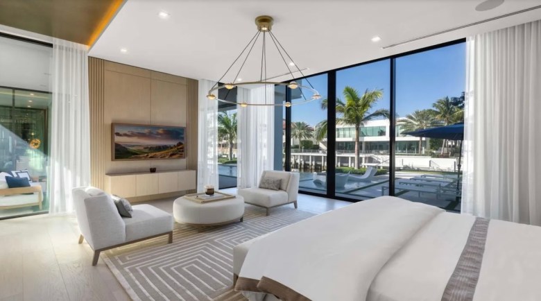 Outside, the residence offers a resort-style pool, spa, fire pit, rooftop terrace, summer kitchen and a private dock. And if that weren’t enough, there’s also a five-car garage with showroom-style tandem vehicle display.Â