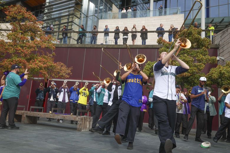 The scene at Seattle City Hall was joyous, slightly chaotic and optimistic after the M’s were walloped, 13-4, in Wednesday’s Game 3 in Seattle against the Blue Jays. To help keep the mood buoyant, rally organizers (the city of Seattle, Seattle Sports Commission and the Downtown Seattle Association) called on the University of Washington Husky Marching Band and Spirit Squad to hype up a few hundred fans gathered on a crisp October day.