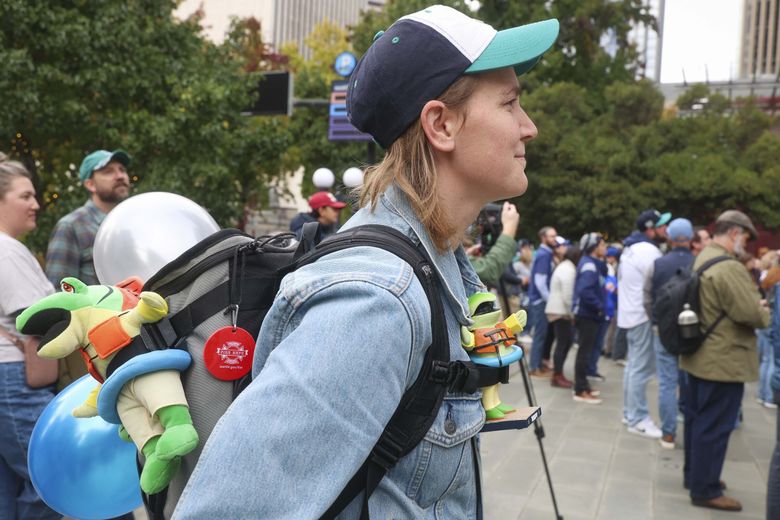 Ren Hauptman showcased her love for the salmon at the rally, sporting a Humpy plush toy clipped to her backpack and a Humpy bobblehead on her chest. She called Humpy’s first-ever win “emotional. Every game we went to, we thought [he would win], but it never was. And then it happened!”