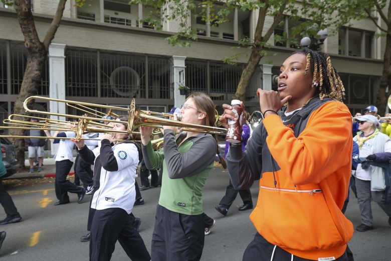 Once the ceremony wrapped up, the crowd began a 1-mile march to T-Mobile Park. With police escorts to clear the streets ahead, the band, the cheer squad members and hundreds of passionate Mariners fans set off with a resounding rally cry.
