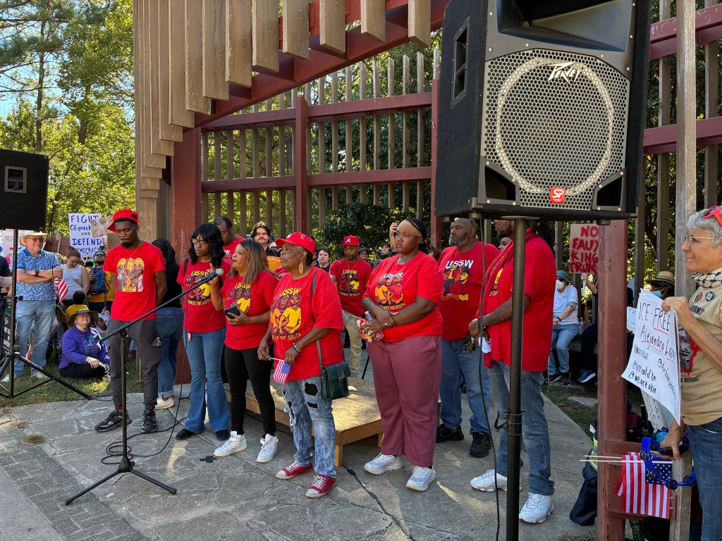 Members of the Union of Southern Service Workers (USSW) speak during the October 18, 2025, No Kings rally in Durham. Credit: Photo by Eva Flowe