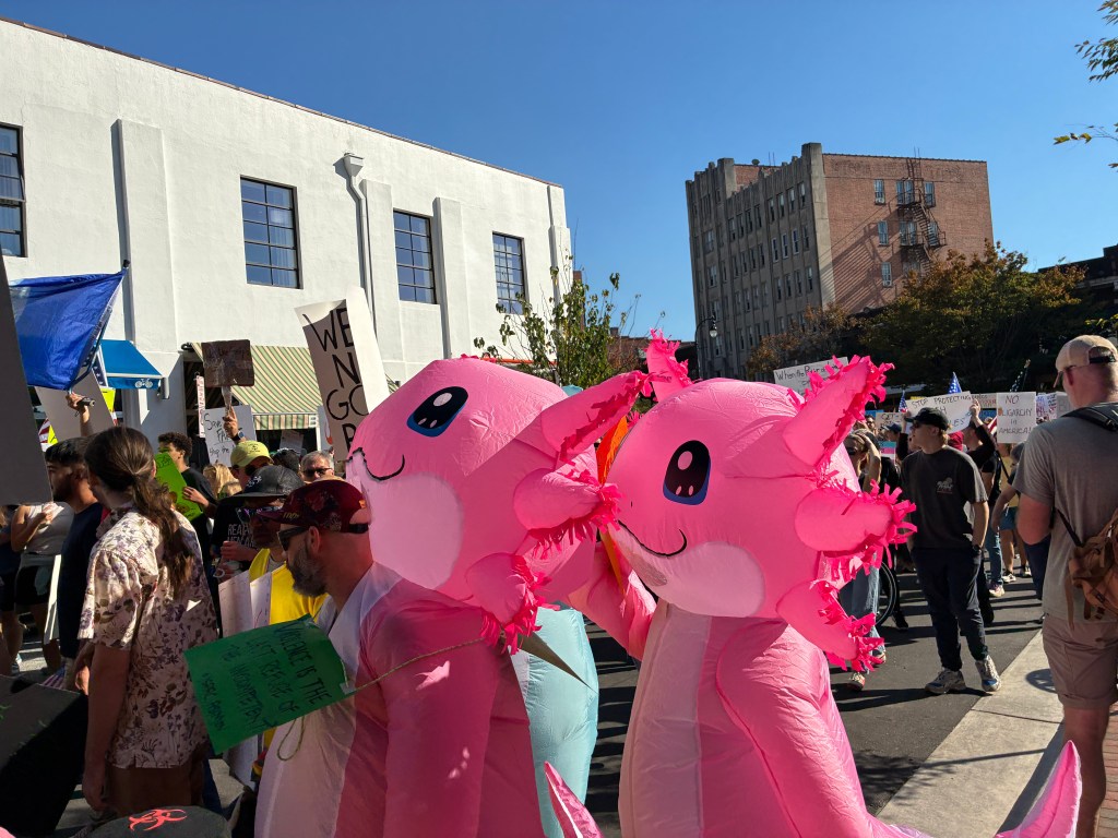 Many other attendees were wearing inflatable costumes, including several axolotls, an elephant and a duck. Retired pharmacist Susan Monpetit dressed as a panda bear as an ode to protestors in Portland, Oregon, where people dressed as inflatable frogs and other critters have been staring down ICE agents.