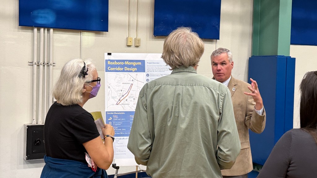Based on the designs shared at the open house Tuesday, reconfiguring Roxboro and Mangum wouldn’t require a ton of major construction. Large design renderings showed two-way traffic patterns, intersection redesigns with new stoplights to help control speeds, and curb adjustments for essential vehicles like fire trucks and buses. Attendees used sticky notes to leave comments or suggestions like “protected bike lanes” and “roundabouts.”