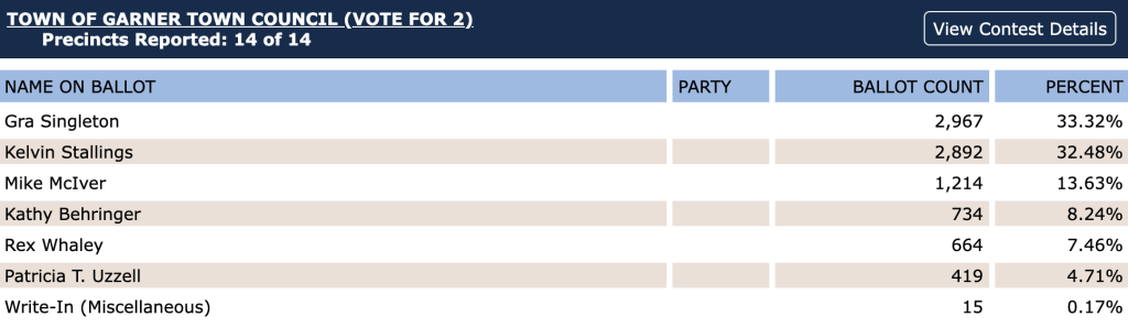 In this six-way race for two council seats, Wake County Democratic Party endorsees again came out on top. Incumbent Gra Singleton, who has served on the council since 1993, won the most votes, more than 33.3 percent. Political newcomer Kelvin Stallings, the director of community engagement at NC CHILD and a former legislative aide at the General Assembly, came in second with 32.4 percent of the vote share. Kathy Behringer, who has served on Garner’s town council for 20 years, placed fourth behind former Garner deputy police chief Mike McIver.