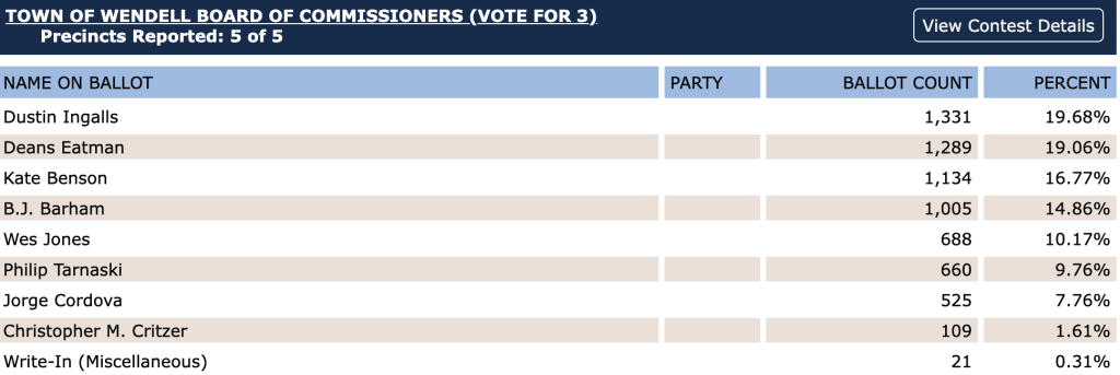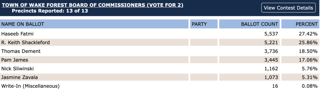 Wake County Democrats-endorsed candidates also won two open seats on Wake Forest’s board of commissioners, ousting one incumbent, Nick Sliwinski, who placed fourth. Haseeb Fatmi, a newcomer to town politics who attended Wake County Public Schools and is an attorney at Ogletree Deakins, won the most votes, 5,537, or 27 percent of the vote share. Incumbent commissioner Keith Shackleford came in second, winning a second term with 5,221 votes, or 26 percent of the vote share.