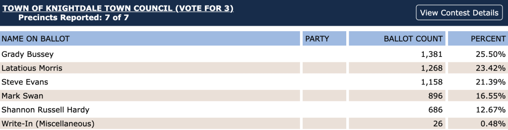 In this relatively low-turnout election for three open seats, Knightdale voters will see two familiar faces back on the town council, and one new one.