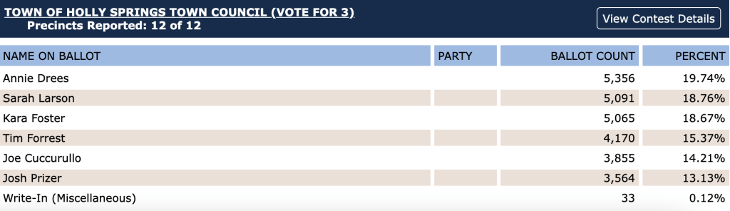 The races were close, but incumbent town council member Annie Drees, an electrical engineer, placed first with about 20 percent of the vote. Political newcomer Sarah Larson, a social media manager, executive director, and event coordinator, placed second, winning about 19 percent of the vote. And Kara Foster, an optometrist, placed third with about 19 percent of the vote.