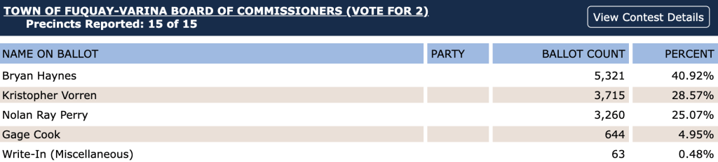 Along with Harris, who retired from the state’s Department of Health and Human Services in 2020 and worked as an adjunct professor at Shaw University, Bryan Haynes and Kristopher Vorren won two seats on the town’s board of commissioners out of a pool of four candidates, taking about 41 and 29 percent of the vote, respectively. Haynes is a first-term incumbent; Vorren is a newcomer to politics.