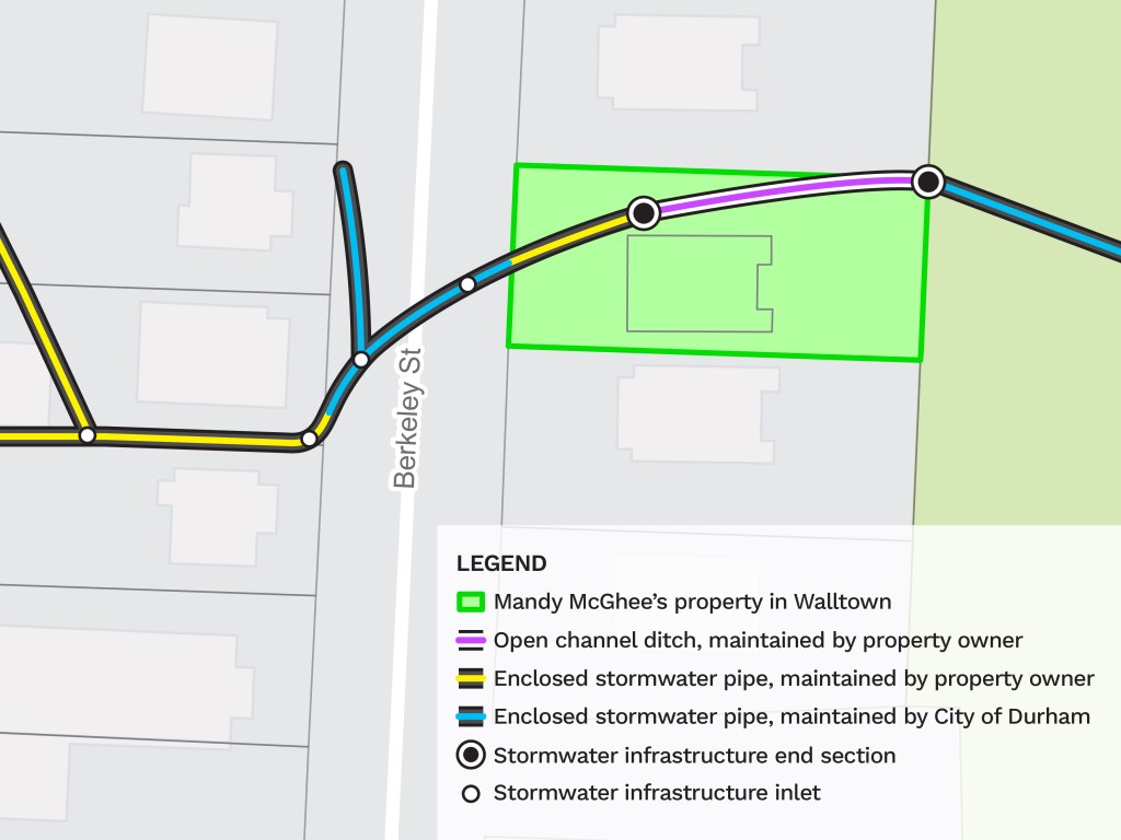 It’s an unusual setup, Eddy says—runoff from an area roughly the size of seven football fields, bearing down on one homeowner’s 0.19-acre yard. And the flow has no doubt intensified over the past decade. As climate change has brought heavier rainfall, and as development has intensified in the area between Duke University’s East Campus and the defunct Northgate Mall, the volume of water coming from the pipe has grown, putting pressure on aging infrastructure. During a single storm in August, Eddy calculated, 700,000 gallons of water flowed onto McGhee’s property.