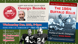 Join us for a Happy Hour History book talk with author George Bozeka. Bozeka, President of the Professional Football Researchers Association, will give a presentation about the PFRA’s new Great Teams Series book, “The 1964 Buffalo Bills: Profiles of the AFL Champions”. Featuring special appearances by 1964 Bills Ed Rutkowski and Booker Edgerson.