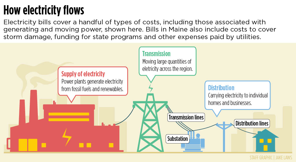 In Maine, power bills cover a range of costs that play different roles in keeping the lights on, including separate rates to generate and move electricity, fund policies enacted by the state government and pay for damage caused by storms.