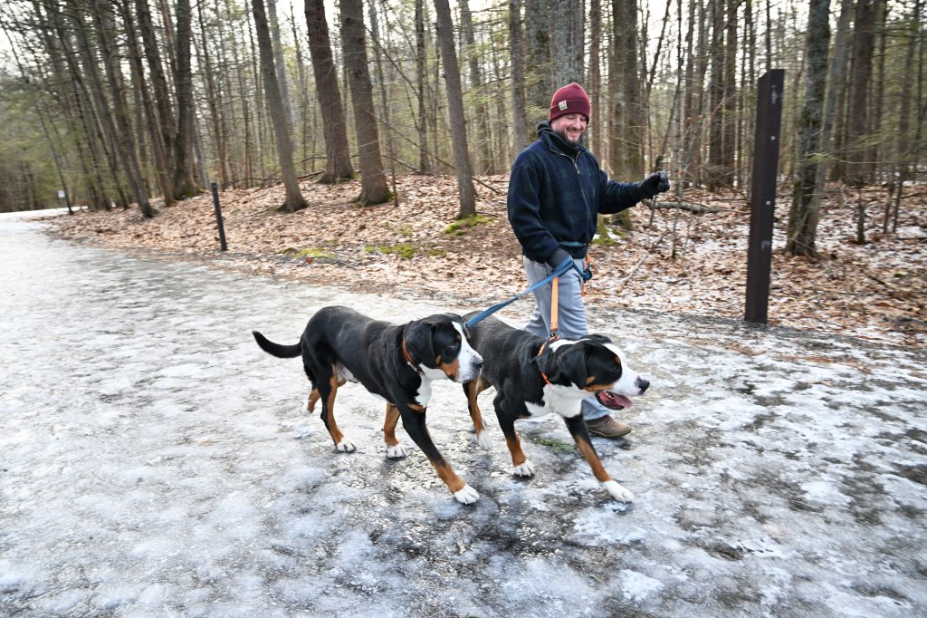 Liam Hobbins, of Saco, hikes through Ferry Beach State Park in Saco with his dogs Summit, left, and Everest on Tuesday. (Shawn Patrick Ouellette/Staff Photographer)