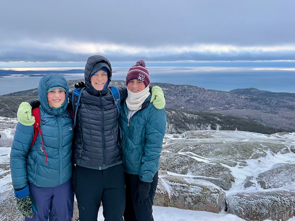 Charlotte Clews, center, of Blue Hill, likes to hike Cadillac Mountain to see the first sunrise of the year with her two daughters. This photo was taken on a previous New Year’s Day with Lucinda, left, and Georgia, right. (Courtesy of Charlotte Clews)