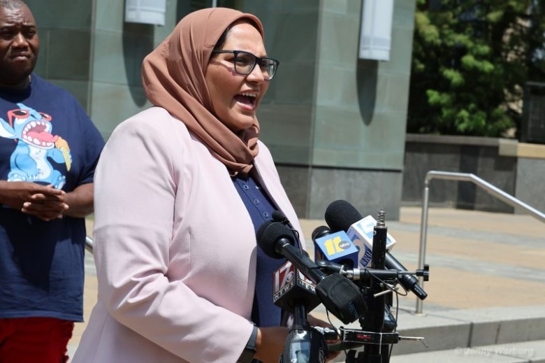 Commissioner Nida Allam addresses a crowd following reports of ICE agents at the Durham County courthouse. Credit: Photo by Jenny Warburg