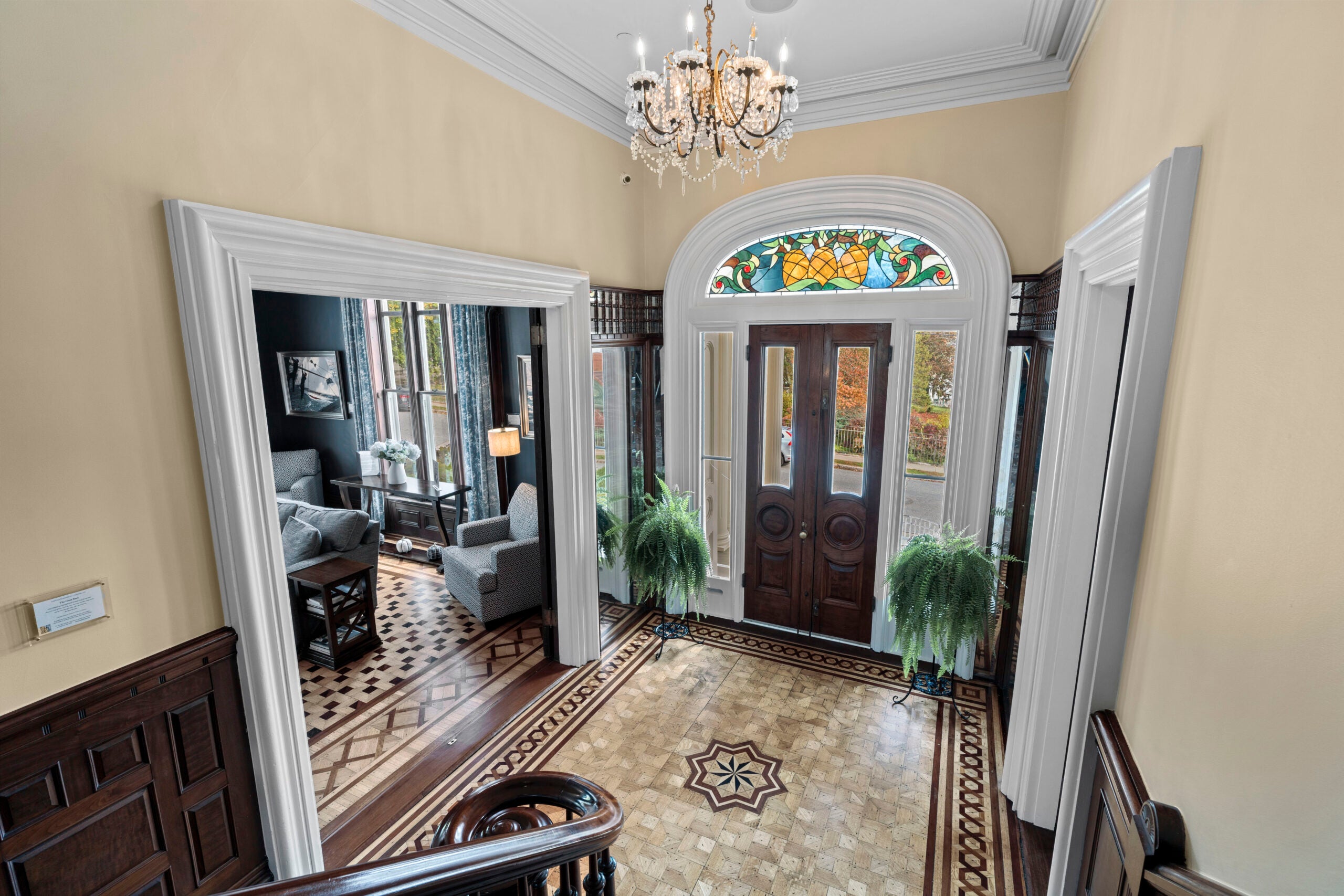 The front door features a stained glass transom. – Rise Media