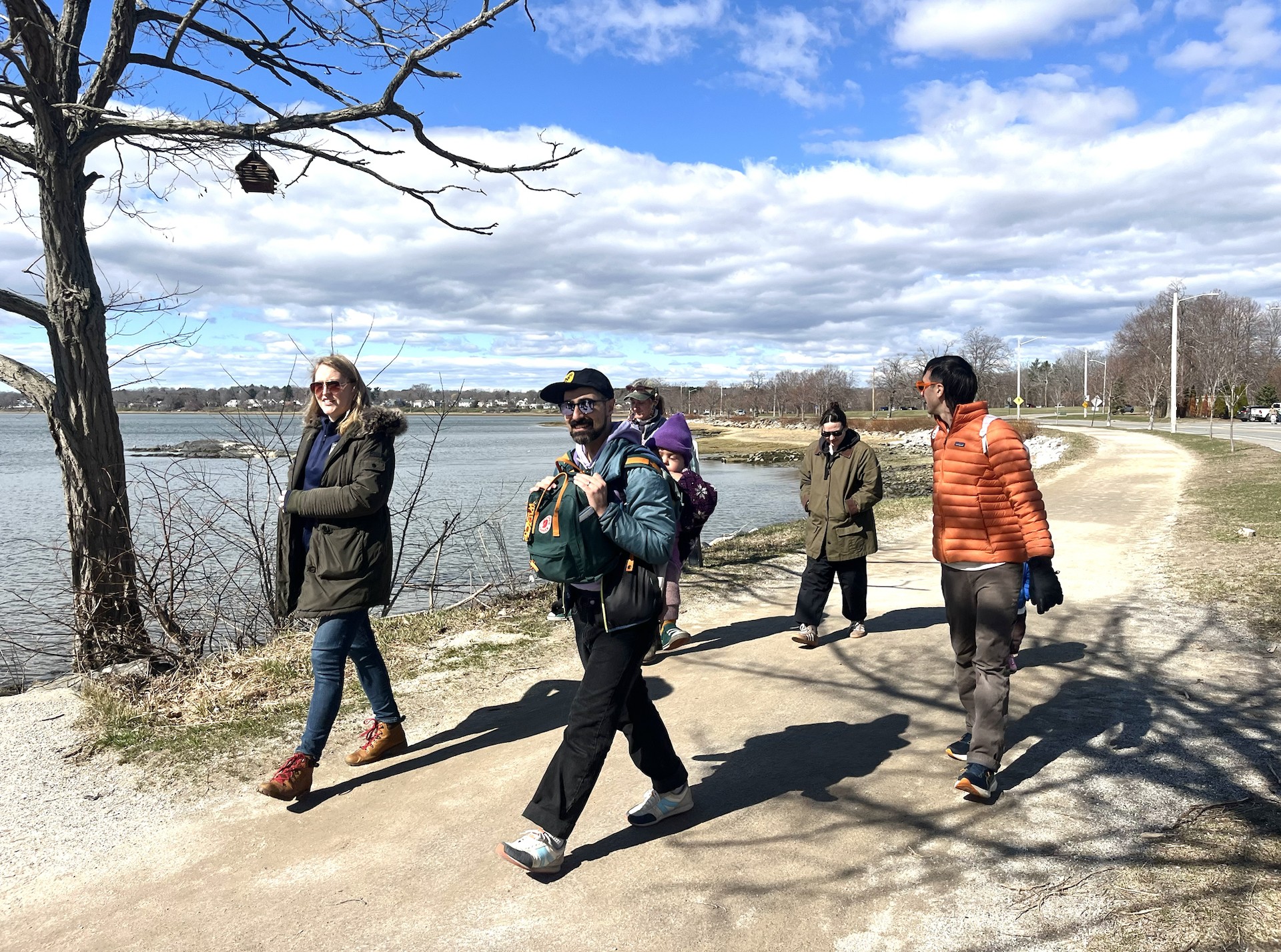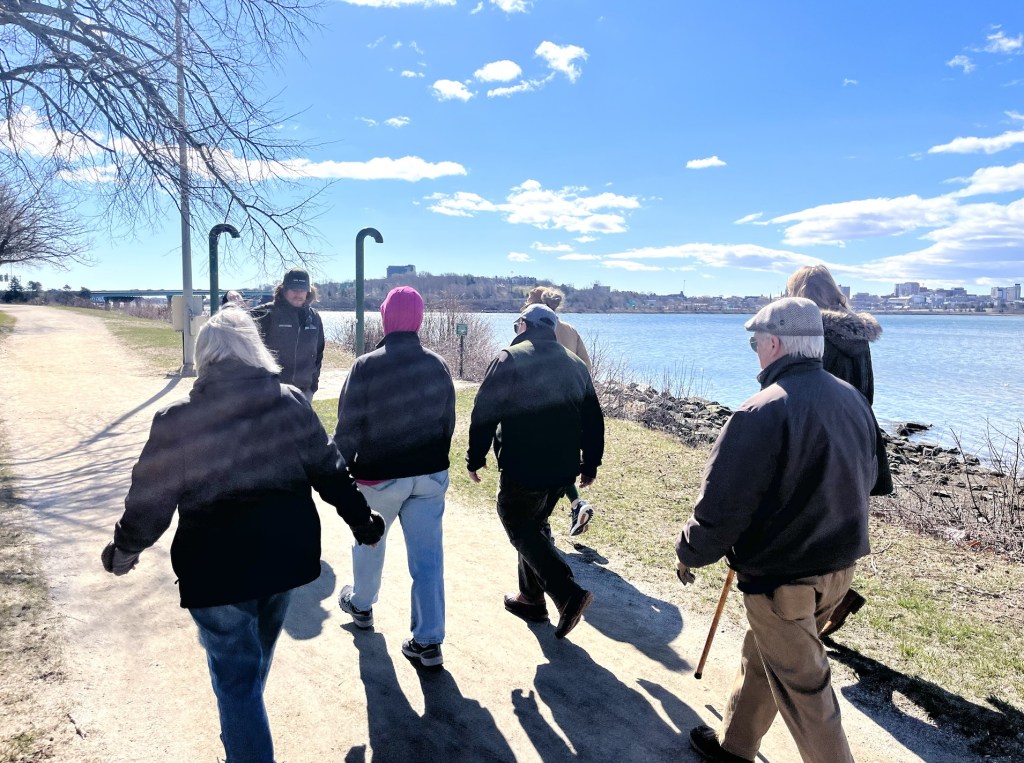 Sun glistened off the water as a group of about 20 hikers set off on Portland’s Back Cove trail Saturday morning.