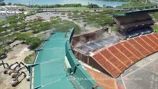 This screenshot made from a drone video shows the first section of Aloha Stadium seating being demolished in Halawa today.