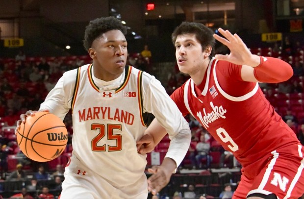 Jan. 19, 2025: MD's Derik Queen #25 drives past Nebraska's Berke Buyuktuncel #9. University of Maryland hosts University of Nebraska in a close game. (Amy Davis/Staff)