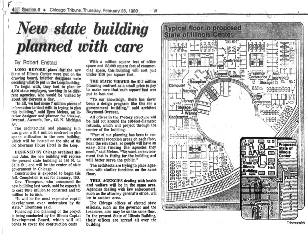 Plans were unveiled for the structure by Thompson. Marching orders for Helmut Jahn, the project’s architect were to create something flexible, modern and unique — not the typical, monotonous, glass-and-steel box. A Tribune editorial called it, “Birth of a landmark.” Tribune architecture critic Paul Gapp said it was “the most visually startling building to be constructed in the Loop since the skyscraper was invented here in 1883.” (Gapp later noted the glass atrium design was a “spinoff” of Atlanta-based architect John C. Portman Jr.’s popular works.)