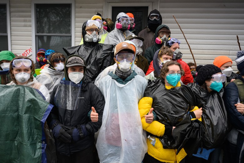 As the day progressed, the group grew larger. People brought pizzas and coffee; someone lit a grill and cooked hot dogs. They donned ponchos and trash bags and distributed umbrellas as it started to rain. Some attempted to barricade the front and back doors to prevent agents from getting inside.
