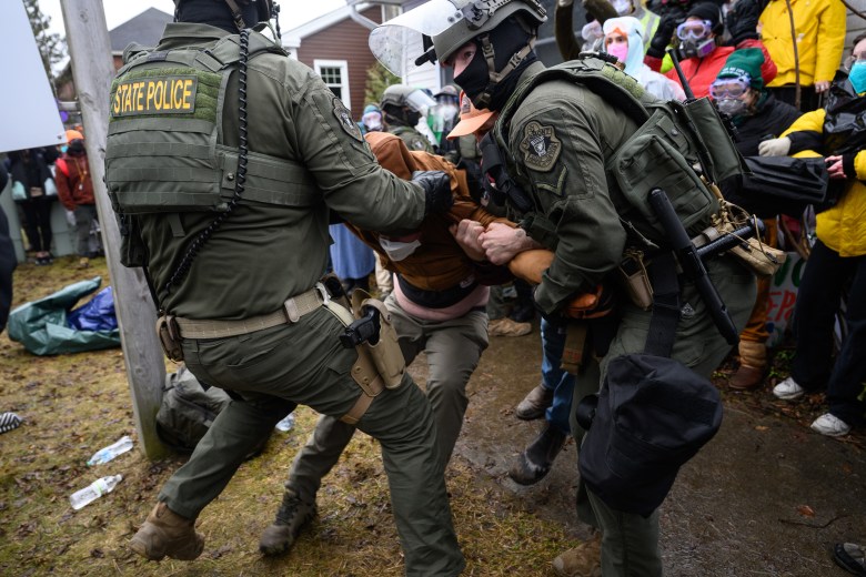State police officers led the way through the crowd, forcibly pushing aside protesters who remained in front of the house. ICE agents followed, breaking in the door and entering the home. About 20 minutes later, they brought out three people, none of whom have been publicly identified or accused of a crime. That’s when the crowd blocked the vehicles from leaving, leading to arrests and violent clashes.