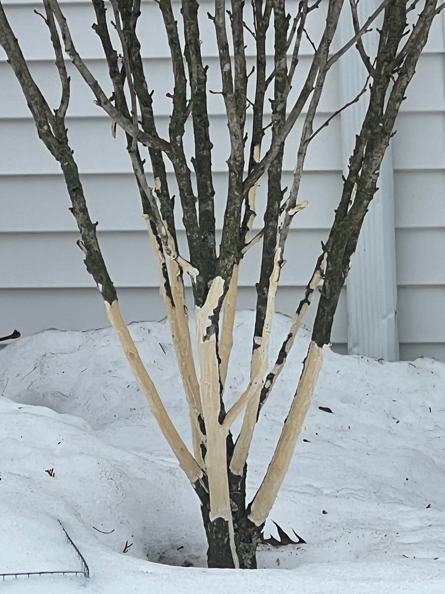 The winter snowstorms have brought a new threat to shrubs and small trees in our backyard. Apparently, it covered up food sources for rabbits, who then turned to the thin bark on the lower parts of shrubs and small trees. Check out the photo I took today of our pink rose of Sharon. I’m afraid it won’t survive.