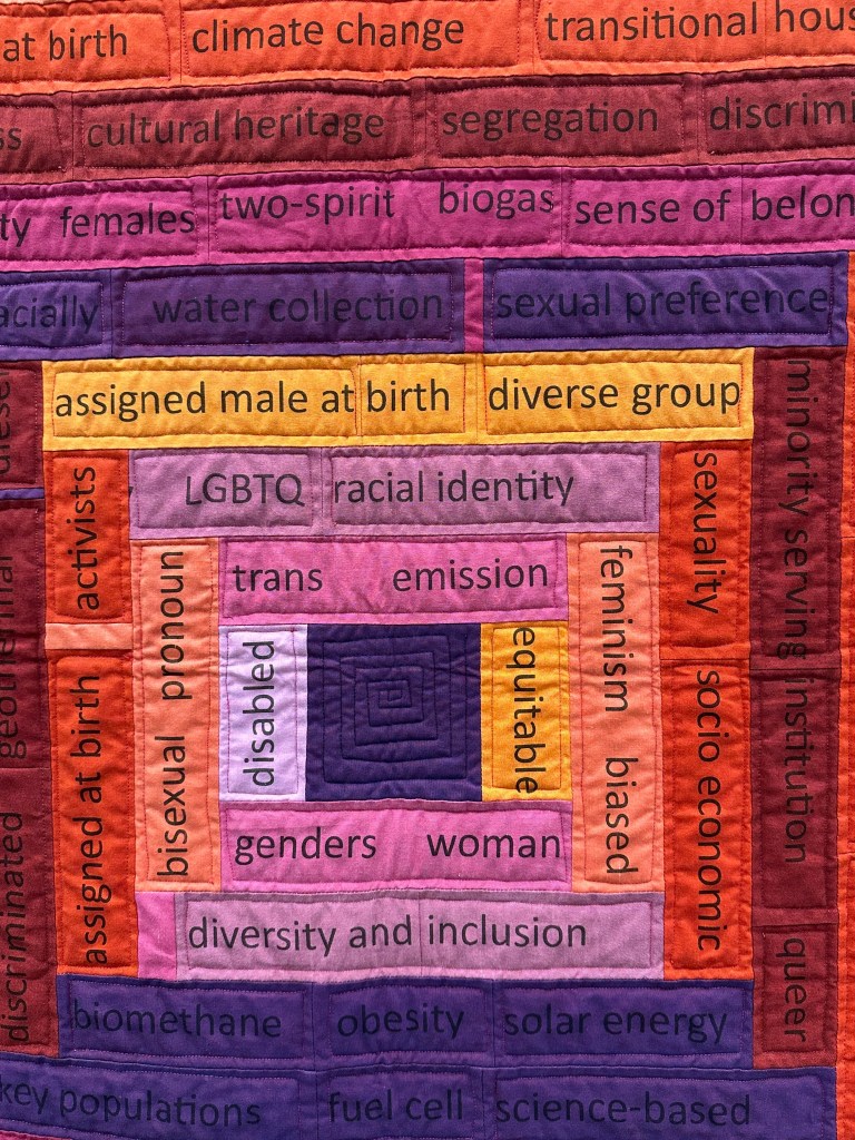 I saw messages on quilts that contained quotes from James Baldwin and Fannie Lou Hamer about liberation and justice; others called for the protection and preservation of transgender rights; many questioned the censorship and erasure of culture, inclusive language, and equity; while a few quilts delved into vulnerable terrain with raw explorations of mental health and body image.