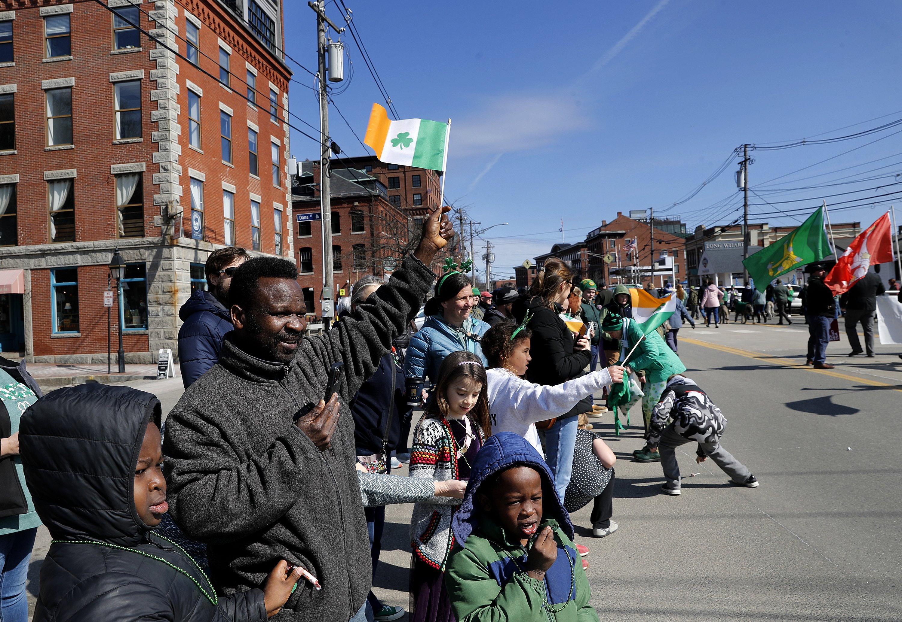 PORTLAND – Parade goers lined Commercial Street in green wigs, leprechaun hats and shamrock sunglasses, waving small Irish flags.