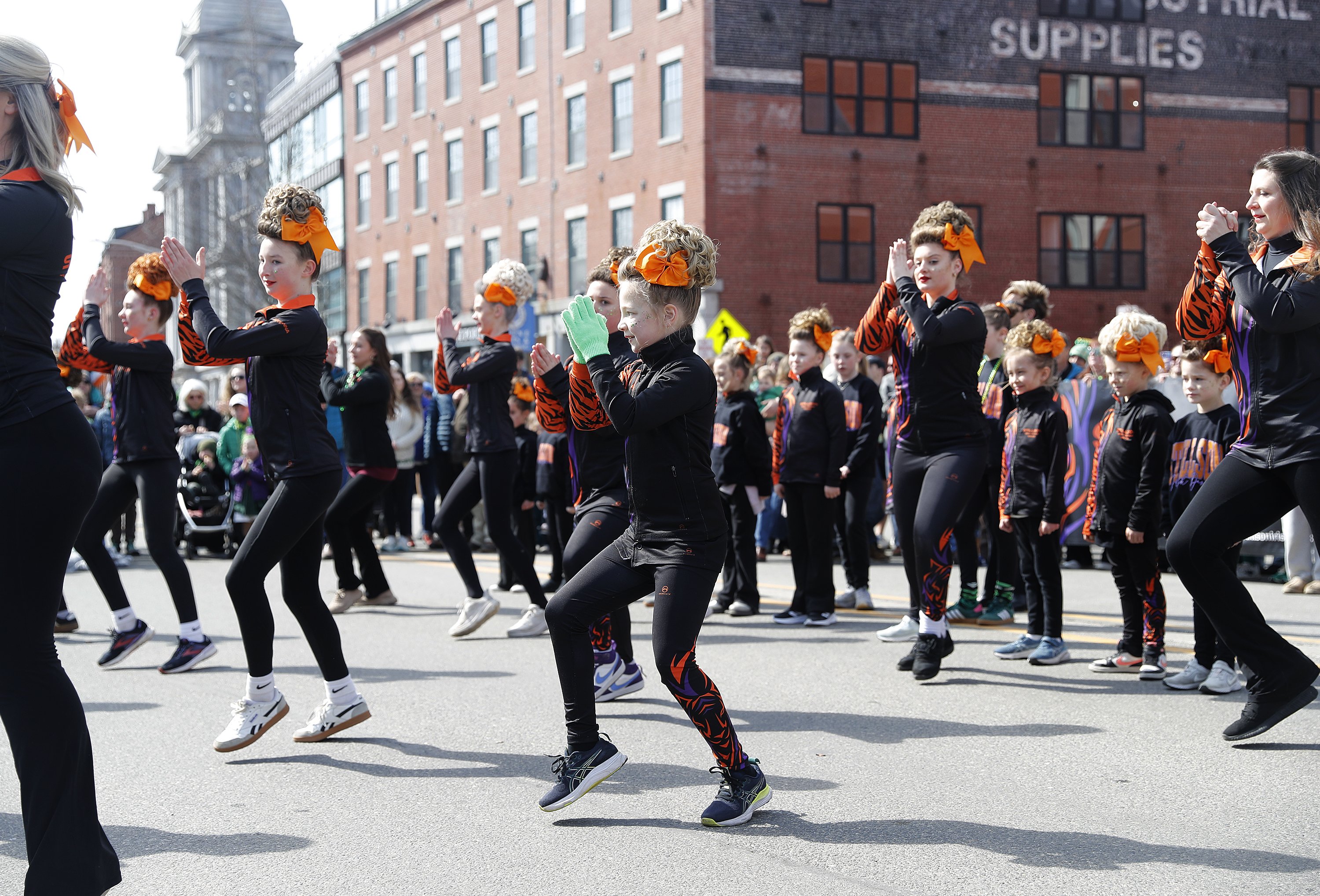 Sisters Clementine and Hattie Muller, 6 and 8, danced in the parade finale in their orange and black athletic uniforms. Clementine’s favorite dance is the light jig, a movement performed in soft shoes that focuses on gracefulness.