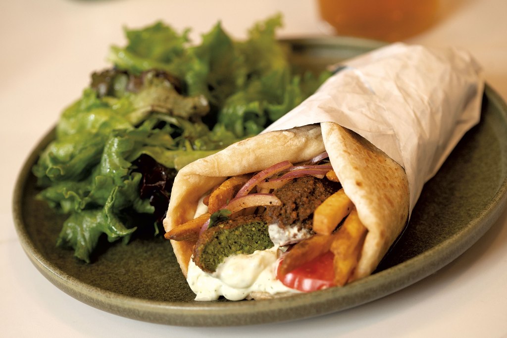 It being lunch, we both opted for sandwiches — falafel ($16) and lamb kebab ($19). (The whole grilled sea bream and the braised lamb shank with orzo will have to wait for a dinner visit.) The yogurty tzatziki sauce on both sandwiches was excellent, mellow but suitably garlicked. The perfectly cooked falafel was herby and green inside. Sally said the ground, seasoned lamb had a lovely flavor with just a little spice, enhanced by pickled peppers. The real star was the pita, cooked in that giant copper oven: fluffy and warm with a subtle flavor and slight chew.