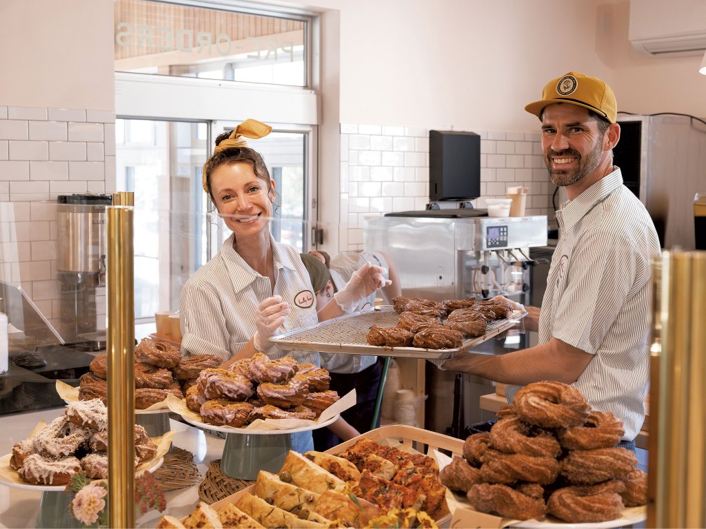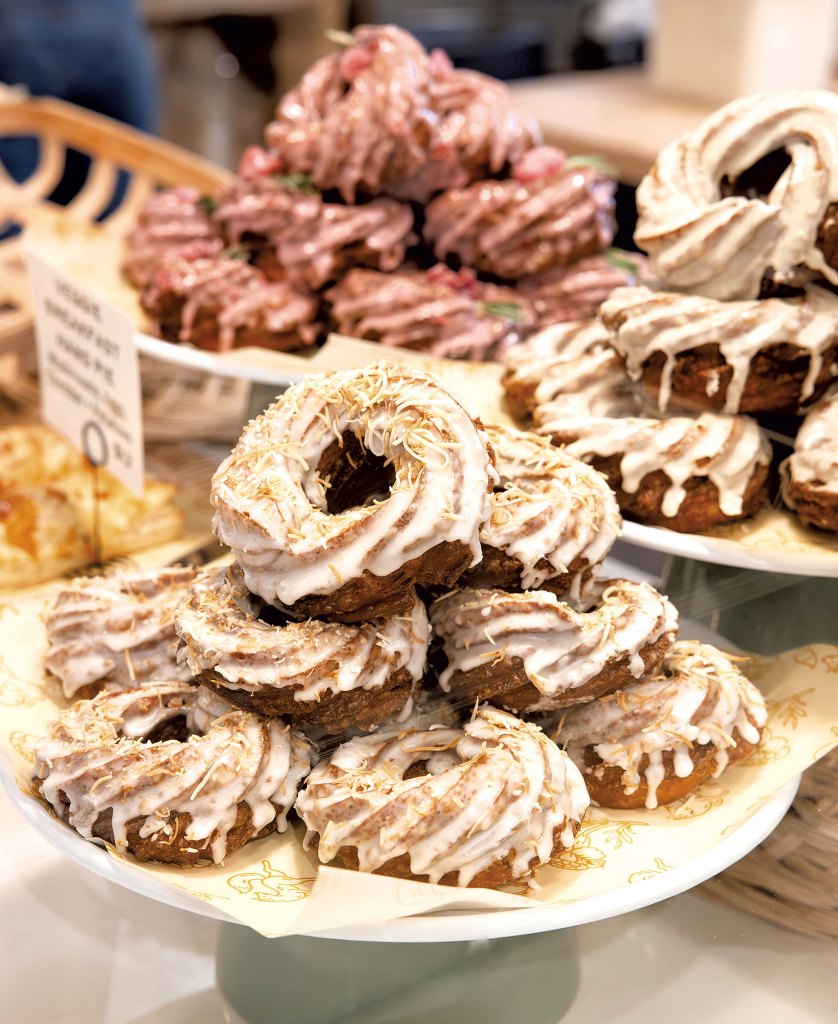 Last October, nearly four years after frying their first doughnut, the couple opened Farmer and the Bell in a two-story geobarn in Woodstock’s East End. With an open kitchen and 82 seats, the bakery is named in part for the Paulys’ farming backgrounds but also nods to the growers and producers who supply the operation with cheese, meats, mushrooms, greens, maple and dairy.