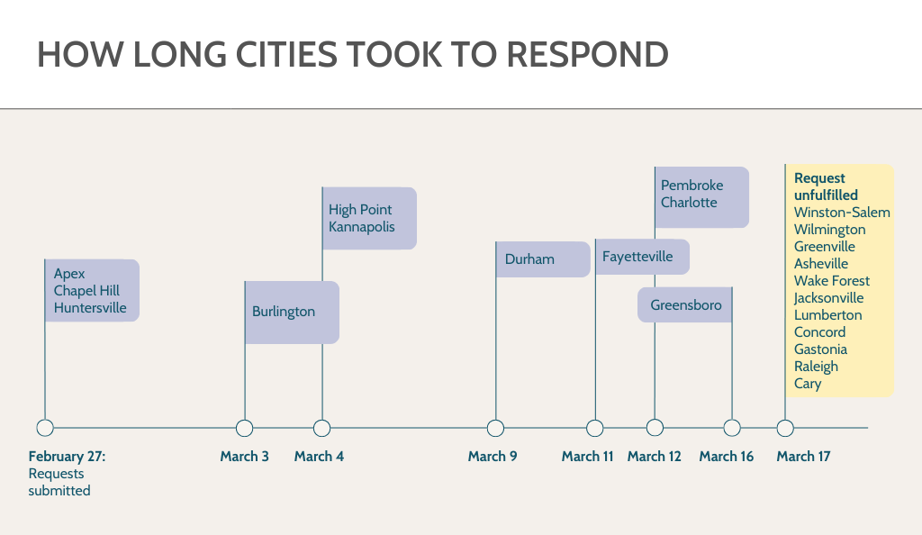 More than two weeks after those inquiries went out, fewer than half of the cities had provided the requested emails. The quickest to respond was Chapel Hill, which shared its documents in less than 30 minutes. Apex provided the emails in just over an hour, and Huntersville also responded on the same day.