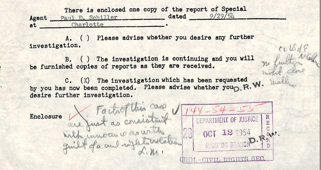 The FBI then forwarded its report to Julian T. Gaskill, the U.S. Attorney for the Eastern District of North Carolina. Gaskill concluded there was no civil rights violation.