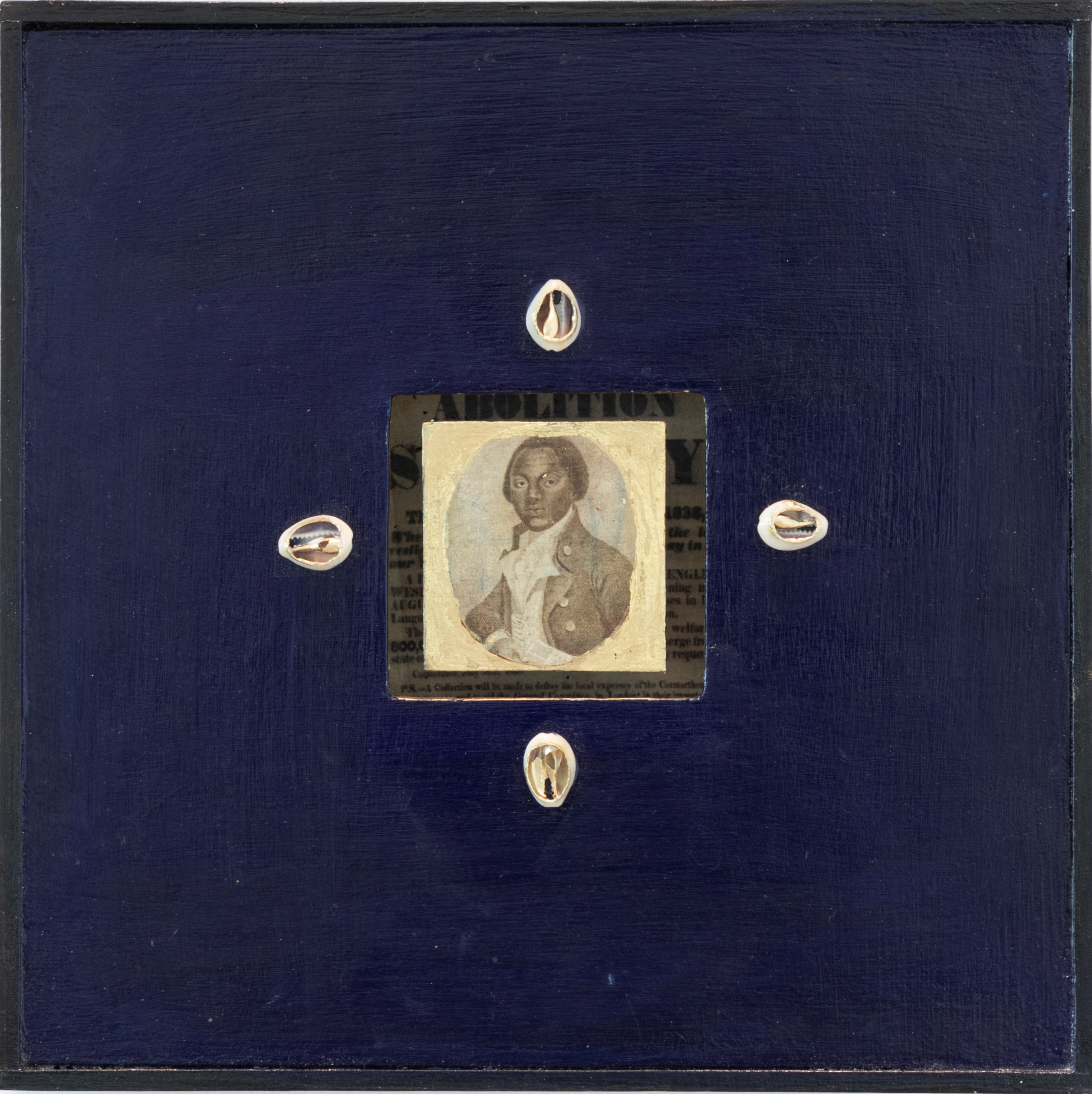 Grenada was central to the trans-Atlantic slave trade from the 17th through 19th centuries, where first the French and then the British forced Africans to cultivate and harvest cocoa, indigo, sugar and nutmeg. Not surprisingly, like many African diasporic artists, Frank employs materials deeply enmeshed with enslaved economies — most extensively indigo pigment — mixing them with others that preserve cultural ties to Africa (here, cowrie shells, which served as currency as well as objects used in spiritual rites).
