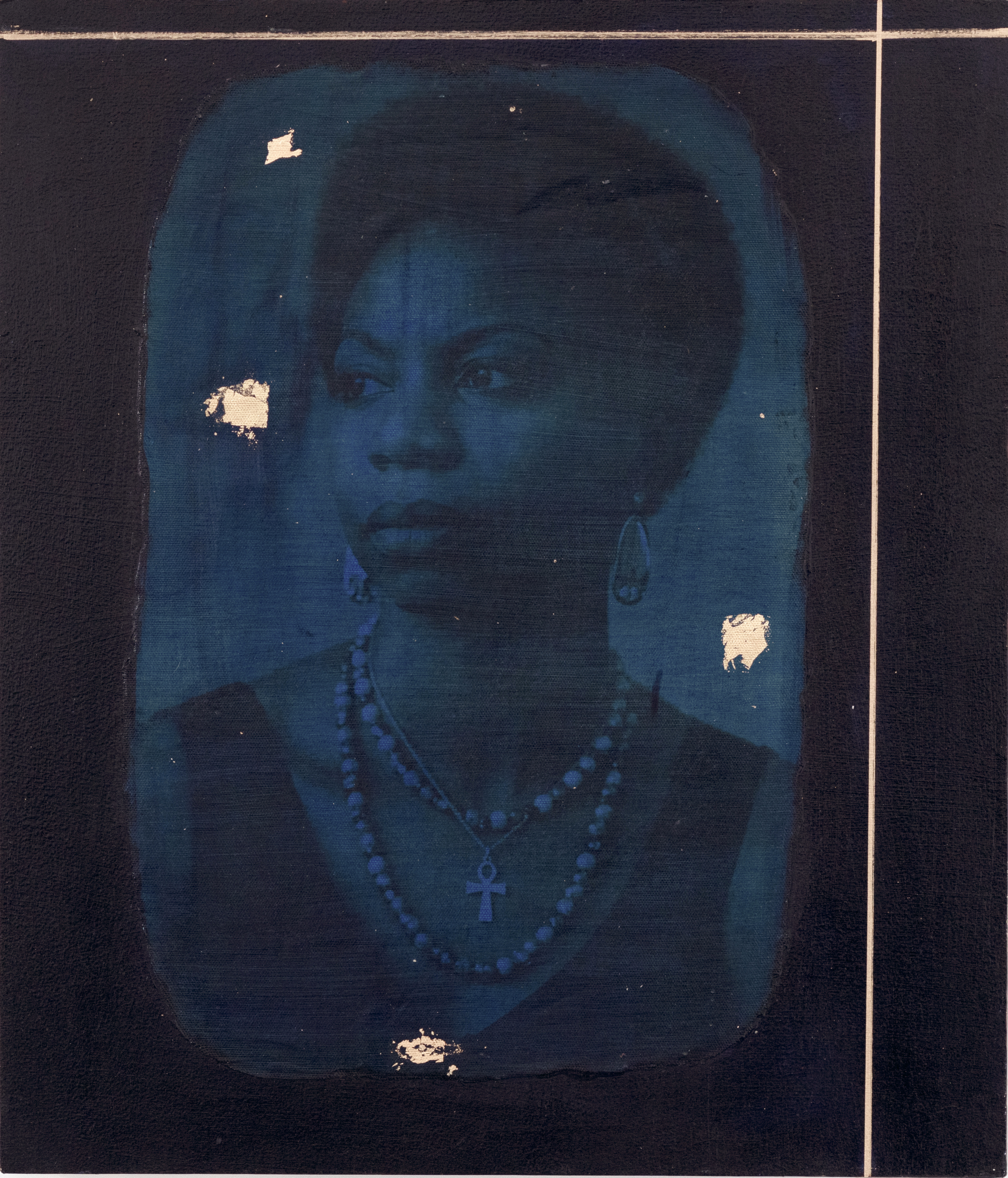When I first saw the indigo-drenched portraits of abolitionists and civil rights figures in “Abolitionists: Cartographies of Resistance and Disobedience” (at Moss Portland through May 23), I thought of medieval and Byzantine icon paintings. Their material richness and deployment of gold and adornments give their subjects a reverential, almost saintly aura.