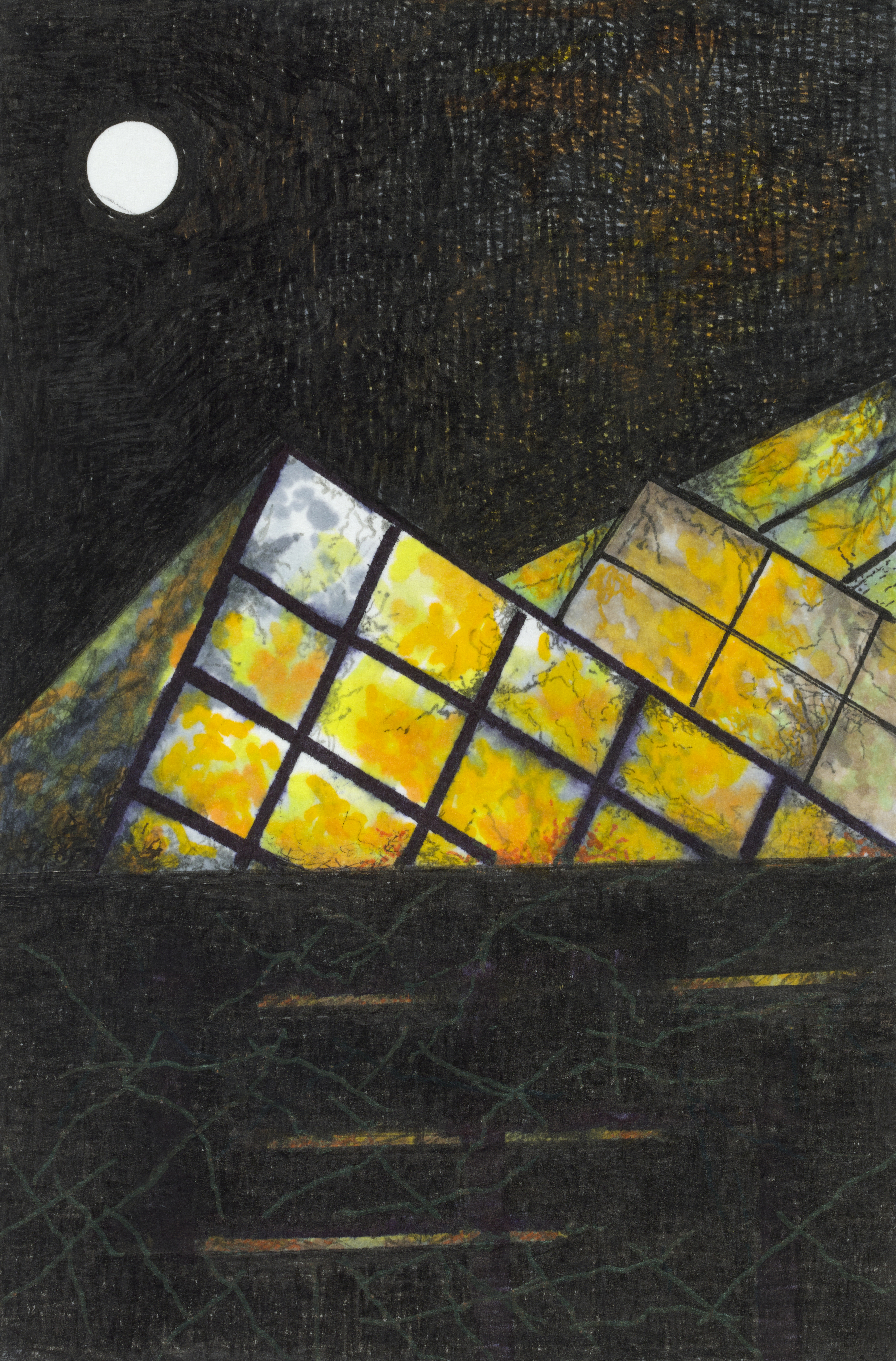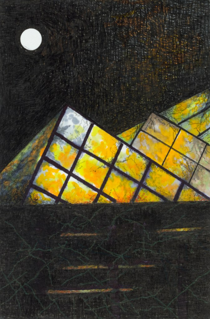 The drawings in chimera are all ink on paper, a diversion from her usual mix of graphite and colored pencil. Her control of this medium is just as astonishing as the command she brought to her latter materials. The densities and transparencies Auslender achieves with ink are mesmerizing, as is the exquisiteness of minute detail. In one untitled work, what looks like a many-paned window seems to float up out of black space from the left lower corner of the painting, while above it a cloud of her golden triangles floats, some of them no bigger than a particle. The effect is one of dissipation, as if the gold triangles are dissolving into dust as they move toward a light space in the upper right corner. At the extremities of their field, they appear as a glimmering cloud of gold dust.