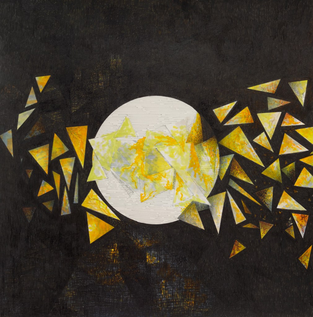 Perceptual space also shifts in mind-warping ways. One may exist on a single plane, such as a work that looks like a mountain range of Louvre-like I.M. Pei pyramids under a full moon. But another presents at least four special planes in different gradients of black that seem to hover over each other, the gold appearing to emerge from between them and fall toward the viewer. In a piece that looks like a moon with gold triangles speeding across its face, we can intuit patches of yellow under the blackness that imply worlds behind worlds.