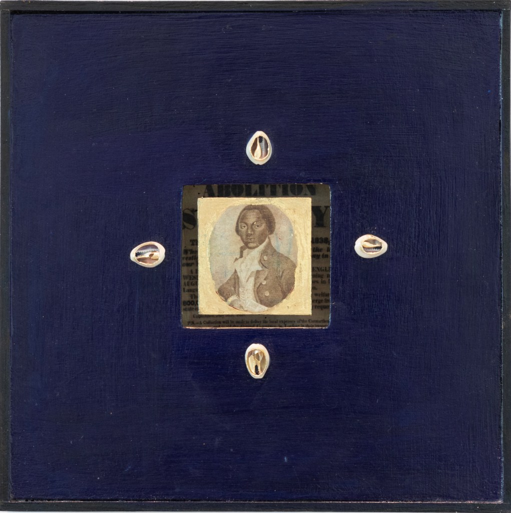 However, Frank’s way of incorporating and manipulating these familiar materials feels not only new, but very nearly sacred. Hence the comparison to icons. The artist’s larger aim is to show us that abolition, rather than an end to the inhumanity of human commerce in Black and Brown lives, is an ongoing struggle. Slavery may be illegal in the modern era, yet we are still disentangling its legacy in the hope that we, according to Frank’s statement, might finally “dismantle the afterlives of bondage, racial capitalism, carceral systems, borders, and regimes of surveillance that continue to regulate Black and brown life.”