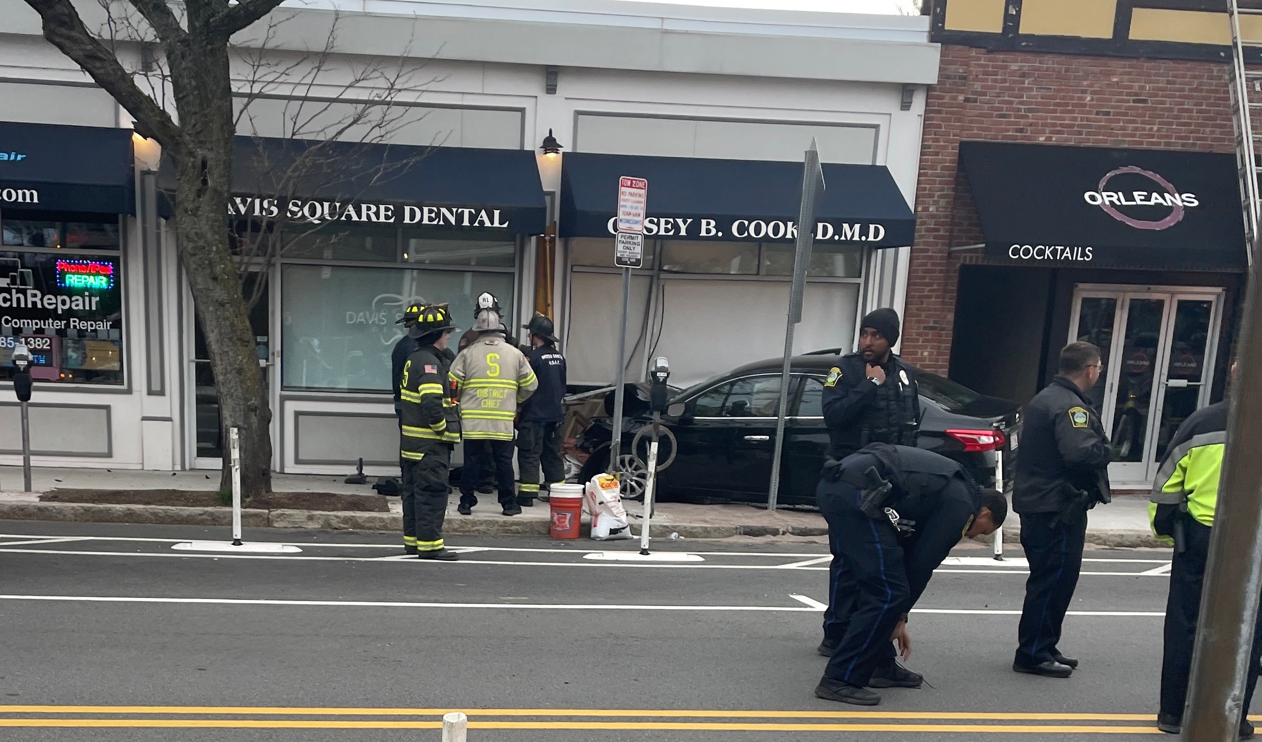 Police rerouted traffic near Davis Square as firefighters removed the wrecked vehicle from the building.